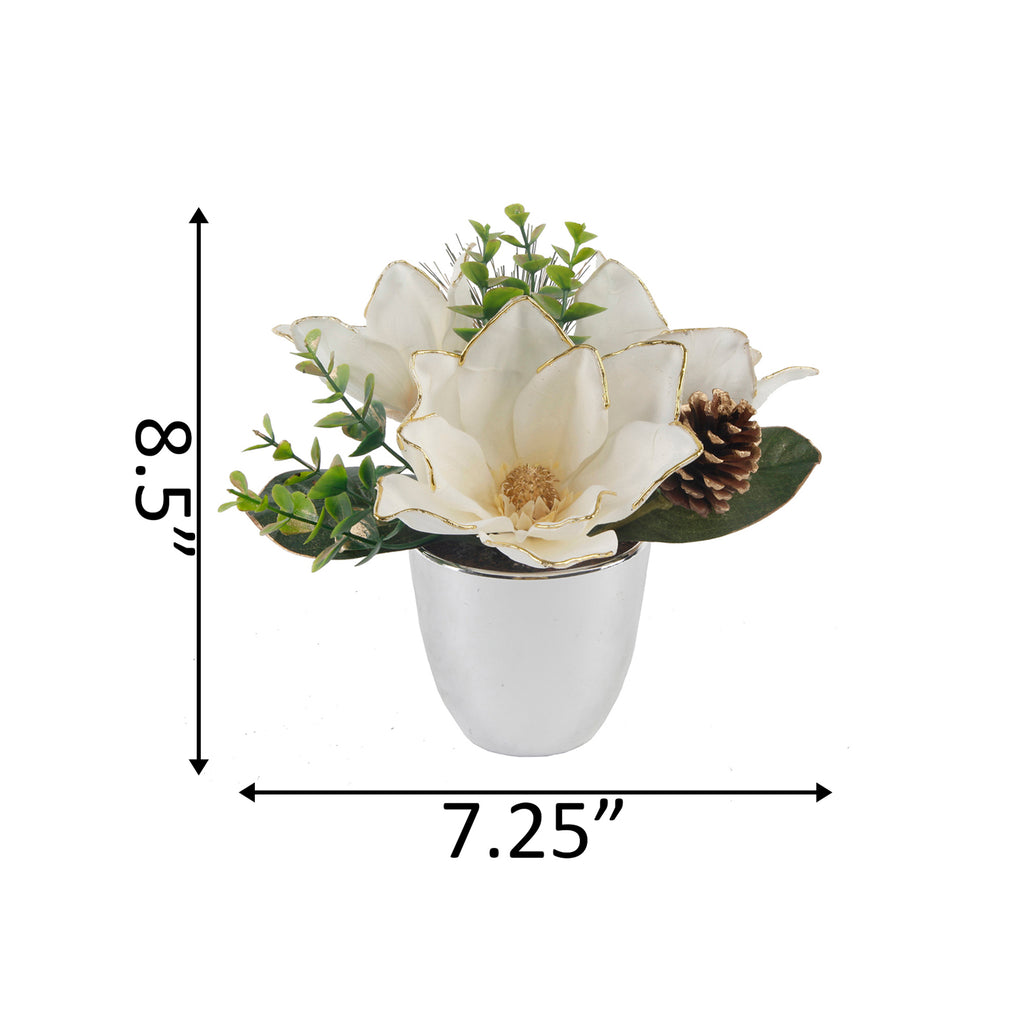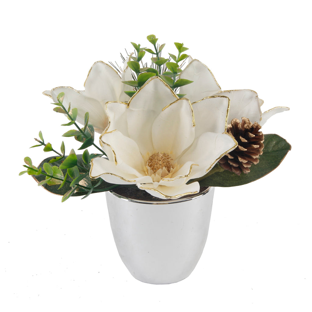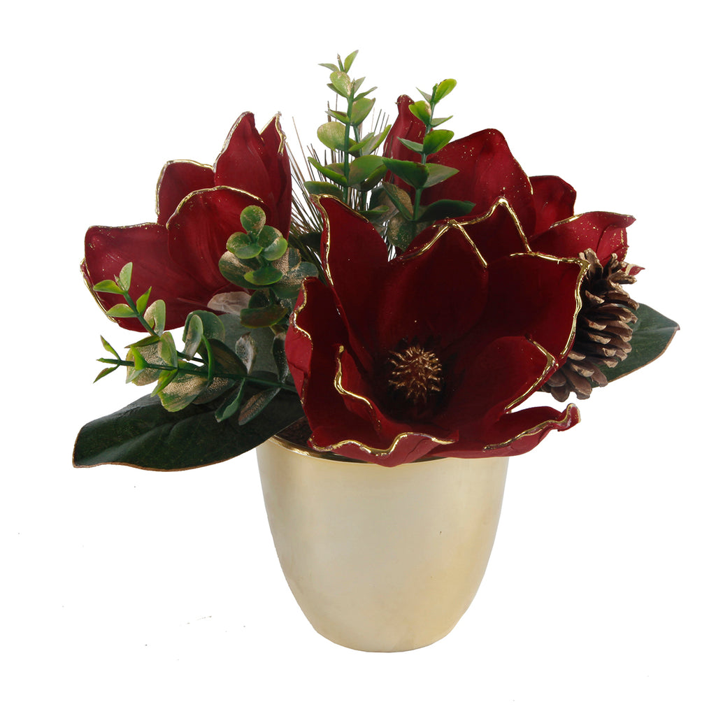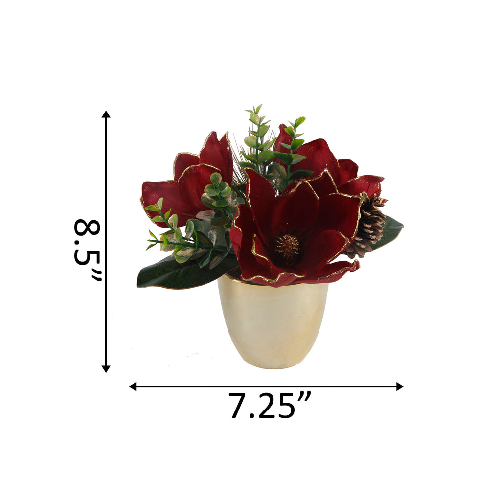 | Christmas is here! Adorn your home or workspace with this adorable Magnolia in Gold Pot. Made of Plastic and painted Gold, this 7.25" x 7.25" x 8.5" planter will add a bit of Holiday Cheer to your living space. Faux Magnolia with Gold Trim are included, so you never have to worry about watering real plants again! Beauty without the pain of caring for real plants. We always strive to make your life easier so you that you can have more time for the important things in life. (Hand-crafted by Artisans; Material: Plastic, Silk; Size: 7.25" x 7.25" x 8.5; Color: Red, Green, Gold). ** No drainage hole, for Indoor Use Only. |