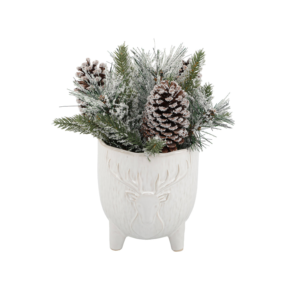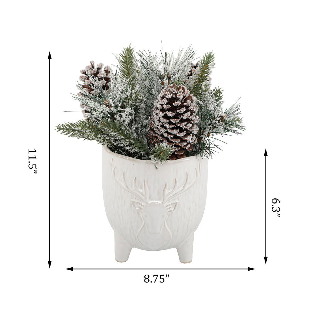 Christmas is here! Adorn your home or workspace with this adorable Christmas Arrangement in Staghead Ceramic Footed Pot. Made of Ceramic and Staghead pattern, this 8.75" x 8.75" x 11.5" Christmas Arrangement will add a bit of Holiday Cheer to your living space. Christmas arrangements are included, so you never have to worry about watering real plants again! Beauty without the pain of caring for real plants. We always strive to make your life easier so you that you can have more time for the important things in life. (Hand-crafted by Artisans; Material: Ceramic, Assorted Christmas arrangements, Plastic; Size: 8.75" x 8.75" x 11.5"; Color: White,Brown, Green, Gold). ** No drainage hole, for Indoor Use Only.