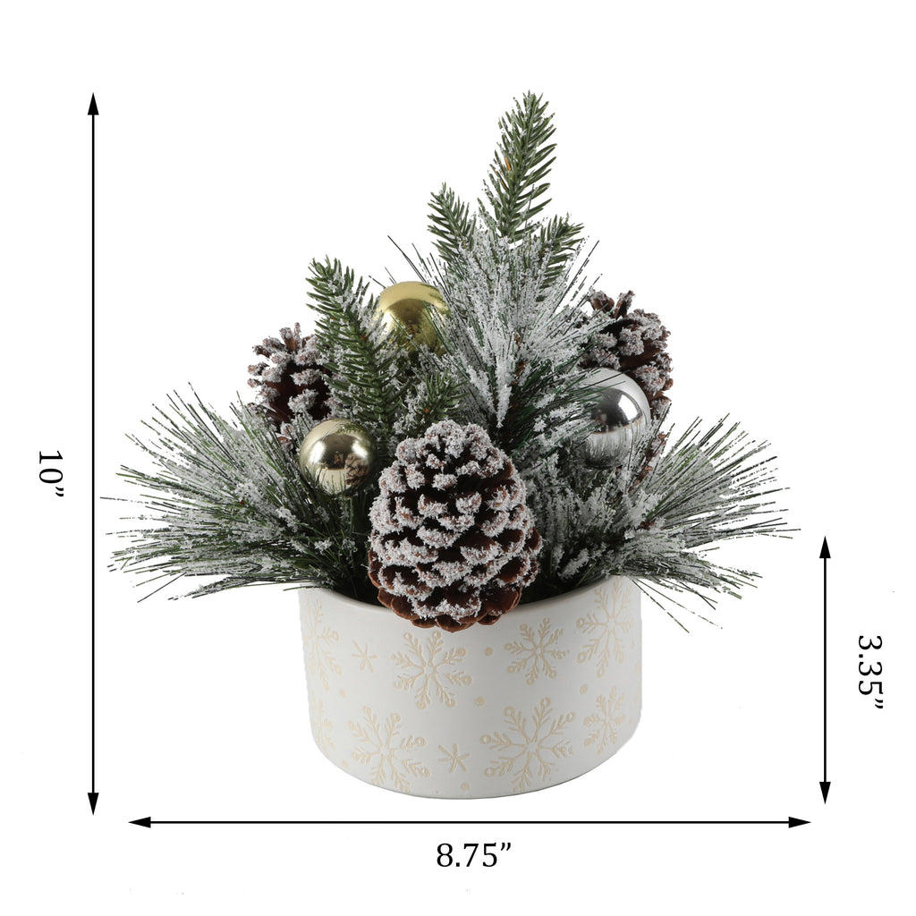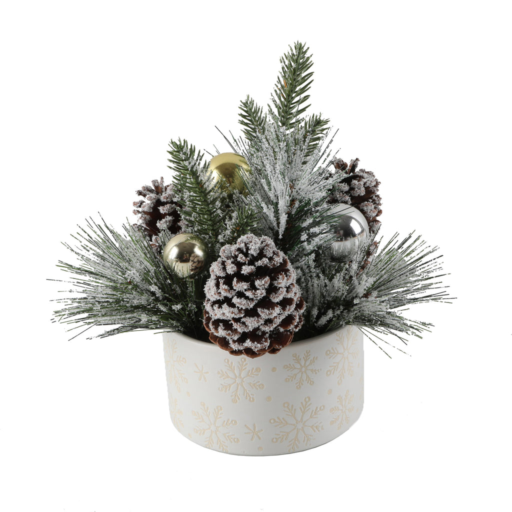 Christmas is here! Adorn your home or workspace with this adorable Set of 2 Christmas Arrangement in 4" Cupcake Ceramic Pot on Wood Stand. Made of Ceramic and painted white with Cupcake pattern, this 6" x 6" x 8" Christmas Arrangement will add a bit of Holiday Cheer to your living space. Christmas arrangements are included, so you never have to worry about watering real plants again! Beauty without the pain of caring for real plants. We always strive to make your life easier so you that you can have more time for the important things in life. (Hand-crafted by Artisans; Material: Ceramic, Assorted Christmas arrangements, Plastic; Size: 6" x 6" x 8"; Color: White, Red, Black, Green, Gold). ** No drainage hole, for Indoor Use Only.