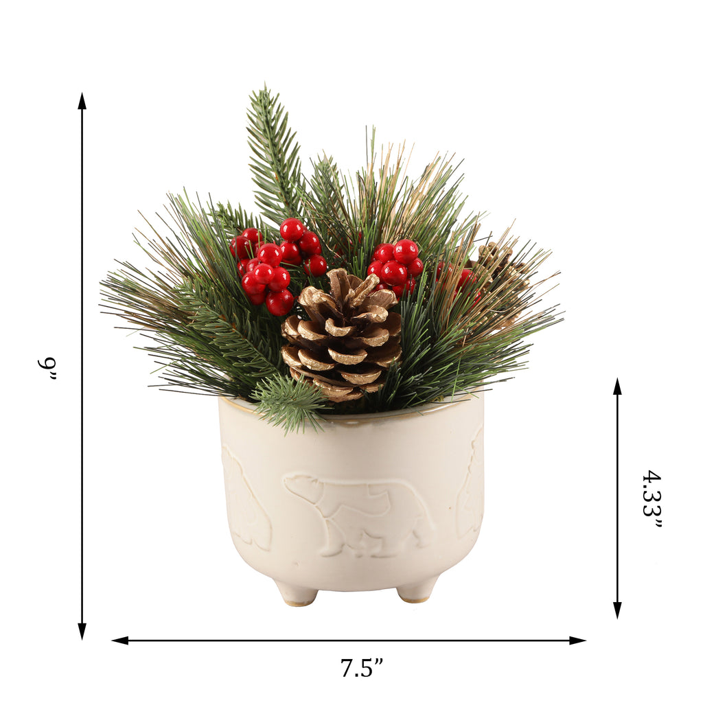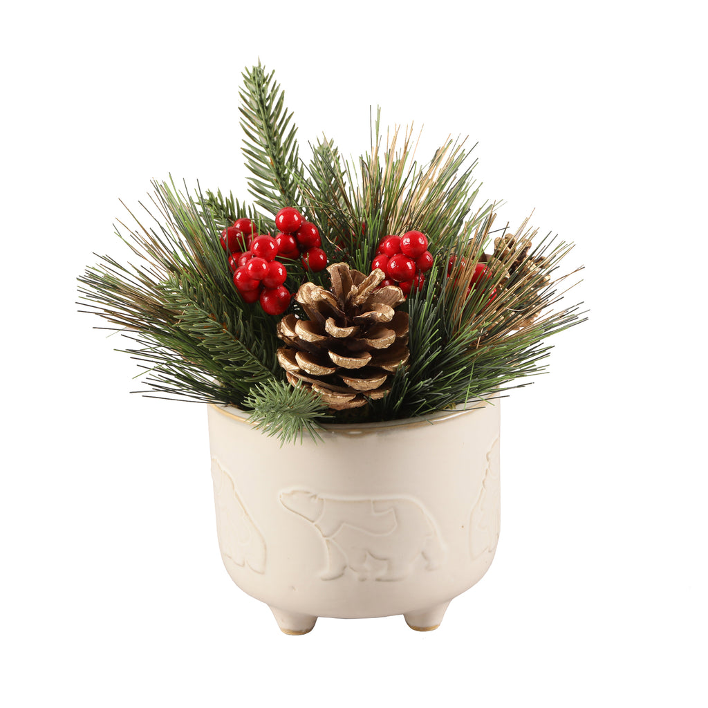 Christmas is here! Adorn your home or workspace with this adorable Christmas Arrangement in 4.75" Bears Ceramic Footed Pot. Made of Ceramic and painted ivory white with Bears pattern, this 7.5" x 7.5" x 9" Christmas Arrangement will add a bit of Holiday Cheer to your living space. Christmas arrangements are included, so you never have to worry about watering real plants again! Beauty without the pain of caring for real plants. We always strive to make your life easier so you that you can have more time for the important things in life. (Hand-crafted by Artisans; Material: Ceramic, Assorted Christmas arrangements, Plastic; Size: 7.5" x 7.5" x 9""; Color: White, Red, Black, Green, Gold). ** No drainage hole, for Indoor Use Only.
