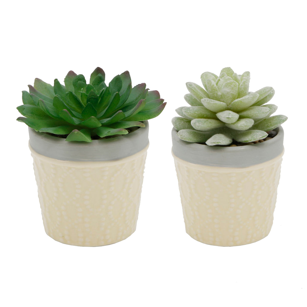 Double the elegance! Place these Faux Succulent Pearl Necklace Planters anywhere in your home or office to create an indoor Oasis. Hand-crafted by Artisans, our ceramic planter with Pearl Necklace pattern will bring a touch of elegance into any room. The planter is made of ceramic with a Pearl Necklace textured pattern, creating more depth and dimension. Painted Yellow with a Gloss finish and Grey rim, this 3.5" x 3.5" x 4.5” tabletop planter will add a bit of chic nature to your living space. Faux succulents are included, so you never have to worry about watering real plants again! Beauty without the pain of caring for real plants. We always strive to make your life easier so you that you can have more time for the important things in life. Buy a few at a time, so you can start your own little Indoor Garden! (Hand-crafted by Artisans; Material: Ceramic, Plastic; Size: 3.5" x 3.5" x 4.5”; Color: Yellow, Grey, Green). ** No drainage hole, for Indoor Use Only.