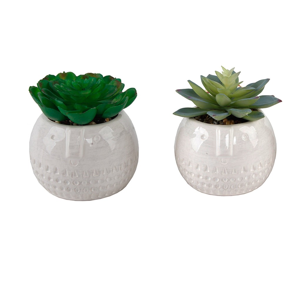 Decorate your home or office with our charming Set of Two White Round Cool Face Succulent planters. Hand-crafted by Artisans using superior ceramic material, these Cool Face planters give a clean and chic feel to any tabletop, entry way, or window sill. Made of Ceramic and White paint, this 4" x 4" x 4” indoor planter will add a bit of charm to your living space. Faux succulents are included, so you never have to worry about watering real plants again! Beauty without the pain of caring for real plants. We always strive to make your life easier so you that you can have more time for the important things in life. Buy a few at a time, so you can start your own little Indoor Garden! (Hand-crafted by Artisans; Material: Ceramic, Plastic; Size: 4" x 4" x 4”; Color: White, Green-succulent.) ** No drainage hole, for Indoor use only.