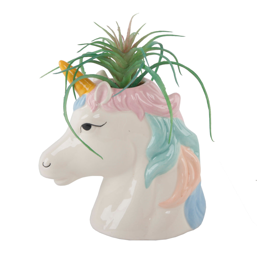 Decorate your home or office with the whimsical presence of our Colorful Unicorn Planter. Made of Ceramic, this indoor planter will add a bit of magic to your living space. Faux succulents are included, so you never have to worry about watering real plants again! Both Adults and Children go Wild for these adorable and fun unicorn planters! (Hand-crafted by Artisans; Material: Ceramic, plastic; Size: 4.9" x 3" x 6"; Color: pink, teal, bue, green.)