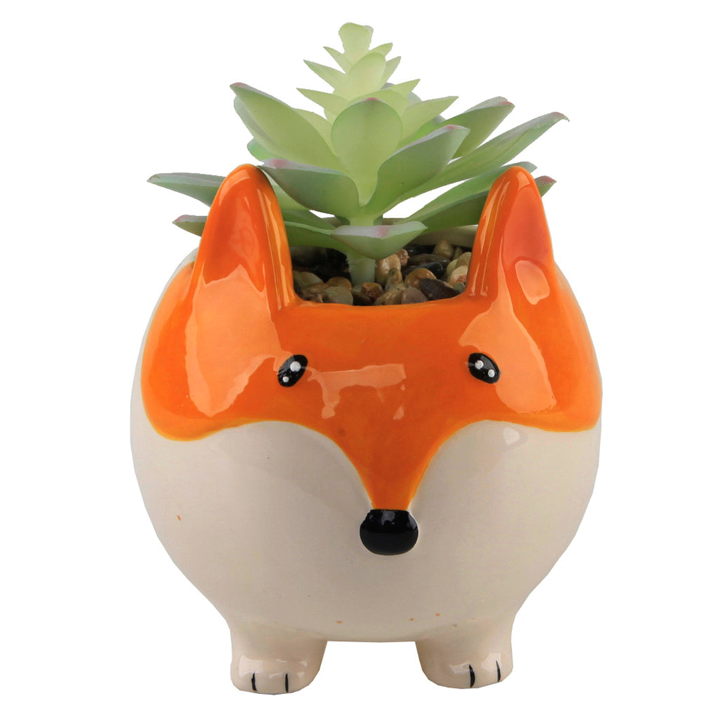 Decorate your home or office in Modern Farmhouse style with our charming Ceramic Fox Succulent planter. Hand-crafted by Artisans using superior ceramic material, these Fox planters give a clean and chic feel to any tabletop, entry way, or window sill. Made of Ceramic and White/Orange paint, this 4.5"x4.5"x6" indoor planter will add a bit of charm to your living space. Faux succulents are included, so you never have to worry about watering real plants again! Beauty without the pain of caring for real plants. We always strive to make your life easier so you that you can have more time for the important things in life. Buy a few at a time, so you can start your own little Indoor Garden! Both Adults and Children go Wild for these adorable and fun Fox planters! (Hand-crafted by Artisans; Material: Ceramic, Plastic; Size: 4.5"x4.5"x6"; Color: White, Orange, Green.) ** No drainage hole, for Indoor use only.