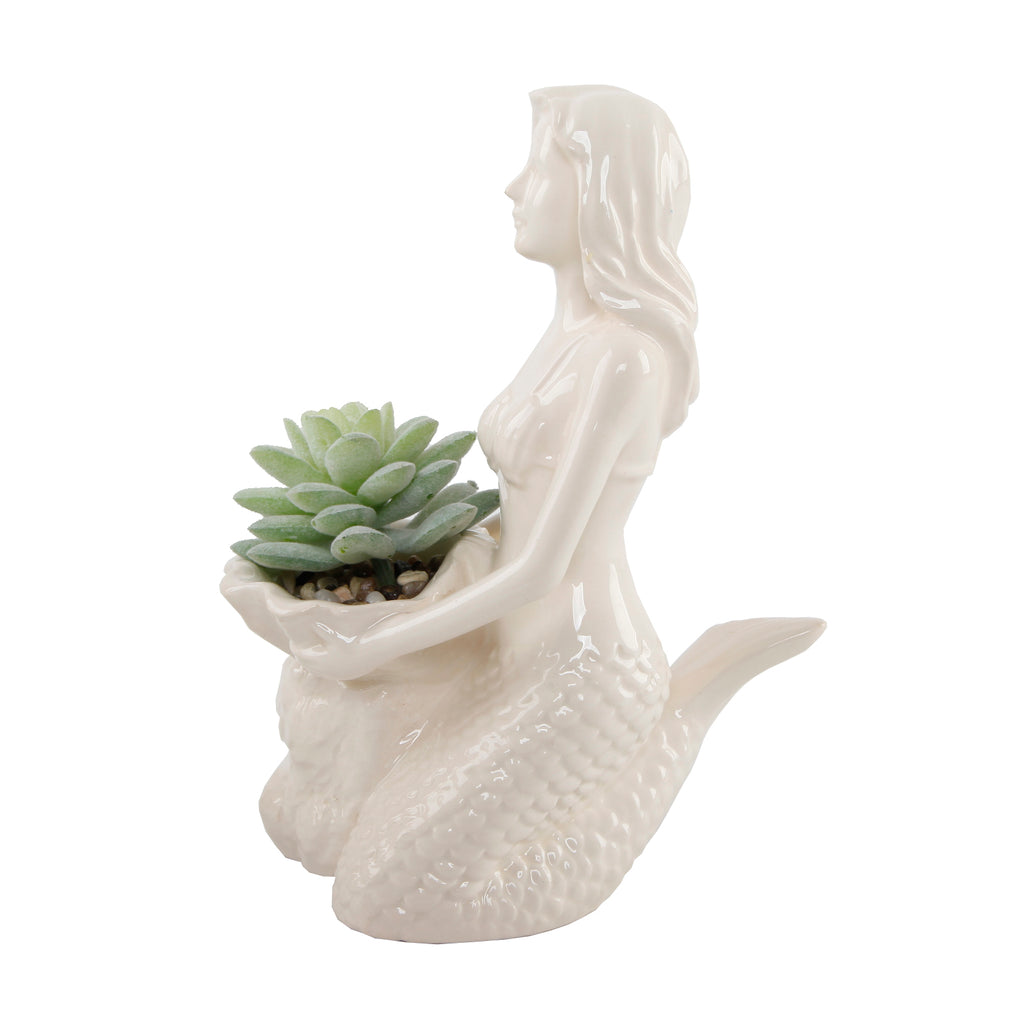 Under the Sea! Place this mermaid planter anywhere in your home to create an underwater oasis. Hand-crafted by Artisans, this ceramic mermaid planter comes with faux succulent prefixed into the planter. Faux succulents are included, so you never have to worry about watering real plants again! Beauty without the pain of caring for real plants. Buy a few at a time, so you can start your own indoor garden! ** No drainage hole. (Size: 6.5" x 4" x 8.25"; Materials: ceramic, plastic, rocks.