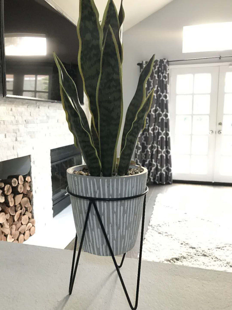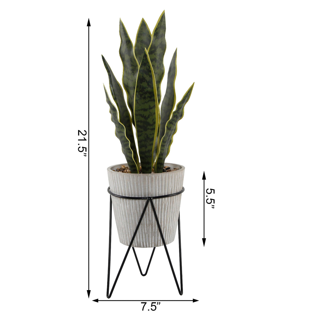 Elevate your space with this Snake Plant in Cement Pot on Metal Stand. Made of cement with a natural finish and resting on a black metal stand, this 7.5" x 7.5" x 21" Faux Snake Plant in cement pot on stand will bring life into any room or office. The earthy design of the planter and the real look and touch of the plants will leave your guests wondering if it's real! Beauty without the pain of watering real plants. Now that's what you call true urban home bliss! (Hand-crafted by Artisans. Material: plastic, cement, metal, rocks. Size: 7.5" x 7.5" x 21". Color: gray, brown, green, black.)