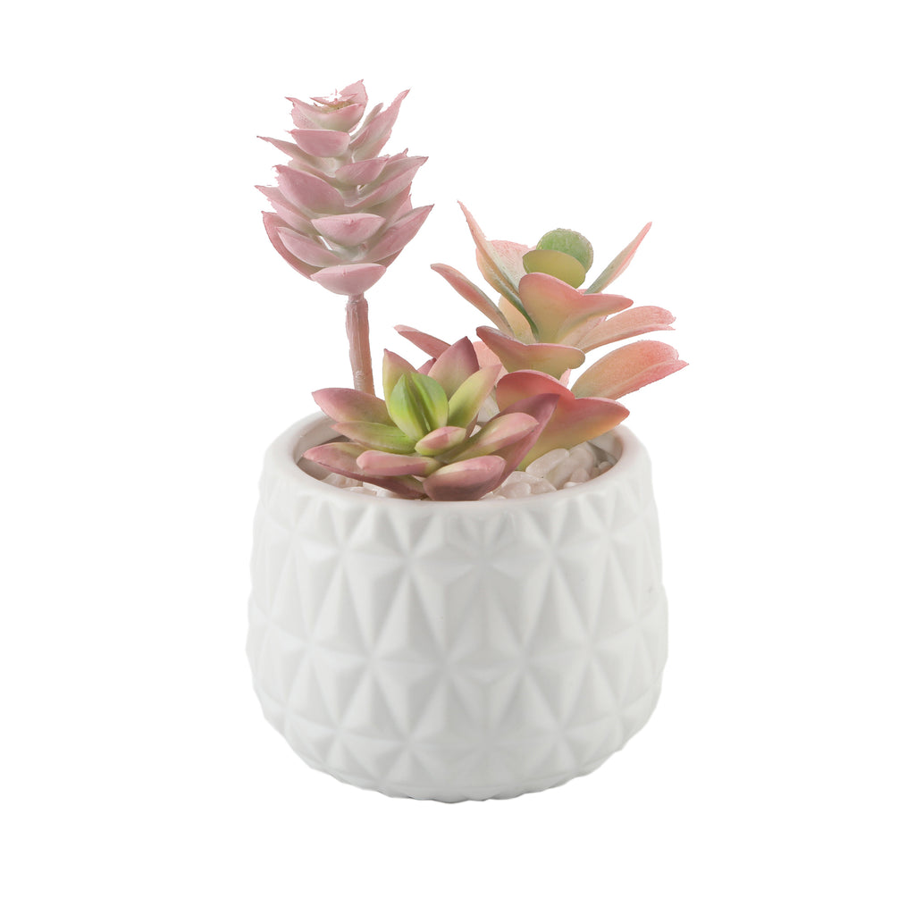Give any space a splash of garden-inspired style with this adorable and fun succulent in ceramic with Kalied pattern planter. This artificial succulent and ceramic planter are carefully handcrafted by artisans. This plant will complement any decor, whether in your home or at the office. This professionally-arranged artificial succulent garden is securely potted. Whether you're sprucing up your nightstand display in the bedroom, want to create an eye-catching centerpiece for your next dinner party or to freshen up your restroom decors, faux plants, like this adorable ceramic crafted succulents garden, is the perfect pick. This unique and cheerful design is perfect party favor to your guests. Crafted from synthetic materials, they stay fresh in any season without having to worry about watering or finding a bright slice of sunlight. No arranging is necessary, only minor shaping, with the way in which we package and ship the product. This item is only recommended for indoor use. (Hand-crafted by Artisans, Material: Ceramic, Plastic succulent,rock Size: 4" x 4" x 6.25”, Color: White, Pink-plants). ** No drainage hole, for Indoor use Only.
