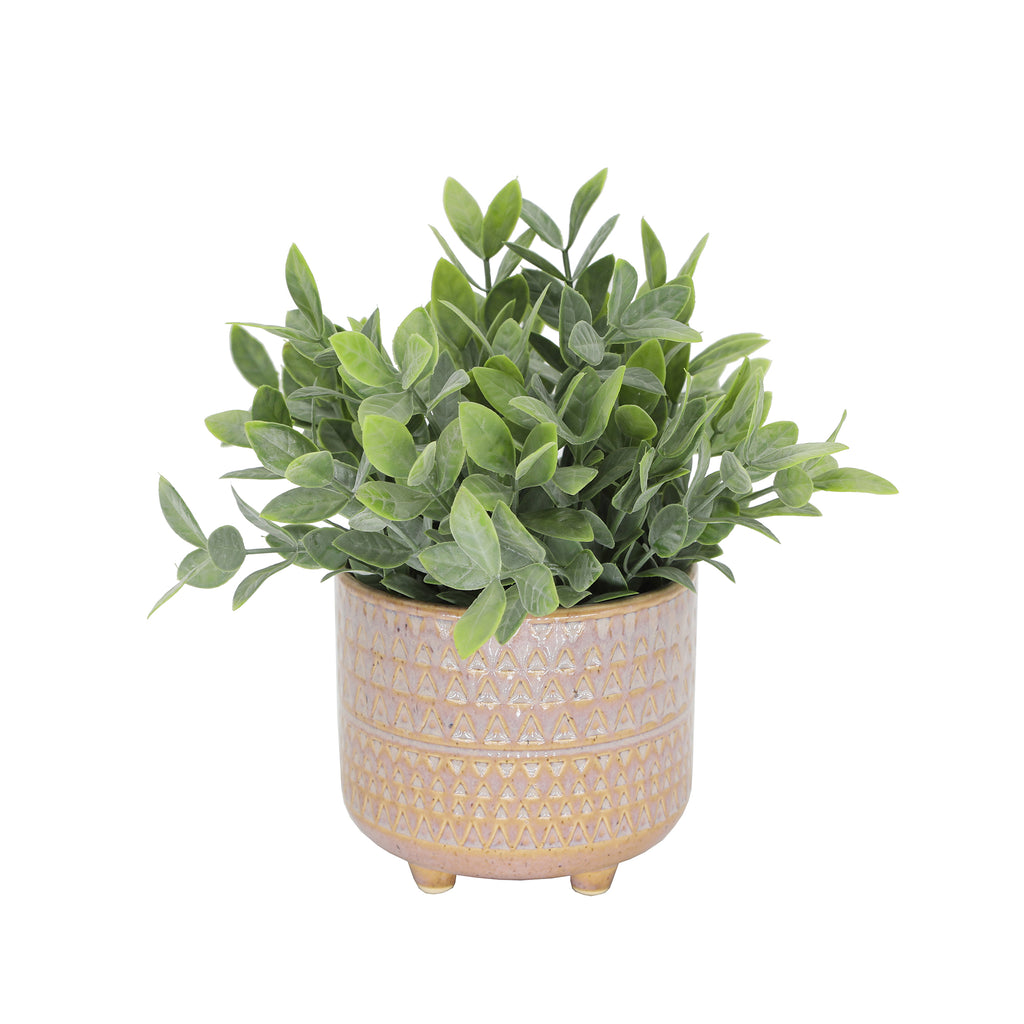 Stand by me! Place this faux Tea Leaf Plant in a PHARAOH pattern planter anywhere in your home to create an indoor Oasis. Hand-crafted by Artisans, our ceramic planter will help upgrade your plant game in style. Made of ceramic and painted Mauve with chic PHARAOH pattern, this 6.5" x 6.5" x 9.5" tabletop planter will add a bit of chic nature to your living space. Faux Tea Leaf are included, so you never have to worry about watering real plants again! Buy a few at a time, so you can start your own little Garden indoors! (Material: Ceramic, Plastic). ** No drainage hole, for Indoor Use Only.