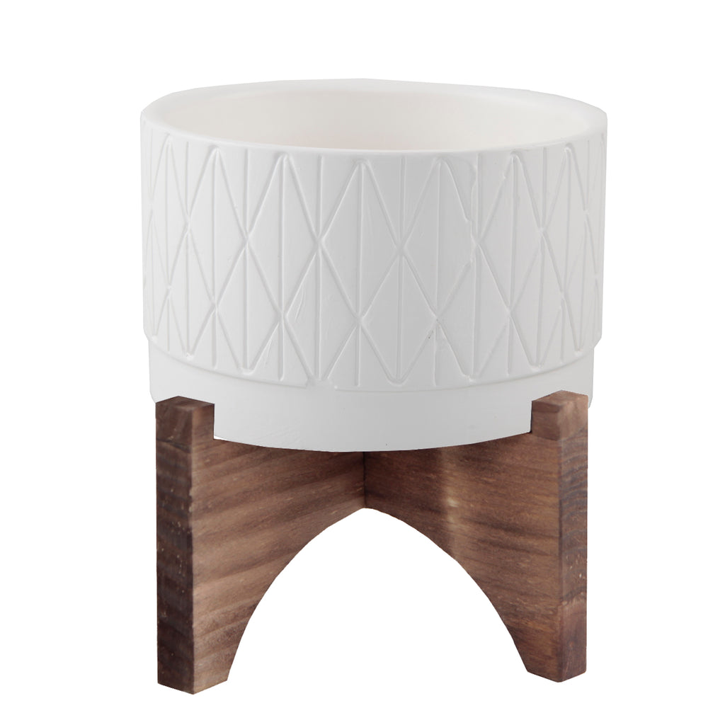 5" Diamond Ceramic POT W WOOD STAND,Matt White