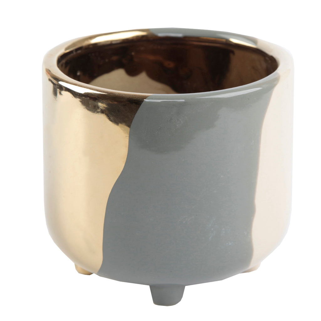 Decorate your home or office in Mid Century Modern style with our charming 3-Tone Footed Ceramic planters. Hand-crafted by Artisans using superior ceramic material, these 3-tone planters give a clean and chic feel to any tabletop, entry way, or window sill. Made of Ceramic and painted Grey, Gold, and Cream, this 4.875"x4.875"x4.25" indoor planter will add a bit of charm to your living space. Buy a few at a time, so you can start your own little Indoor Garden! Both Adults and Children go Wild for these adorable and fun 3-tone planters! (Hand-crafted by Artisans; Material: Ceramic. Size: 4.875"x4.875"x4.25"; Color: Grey, Gold, Cream.) ** No drainage hole, for Indoor use only.