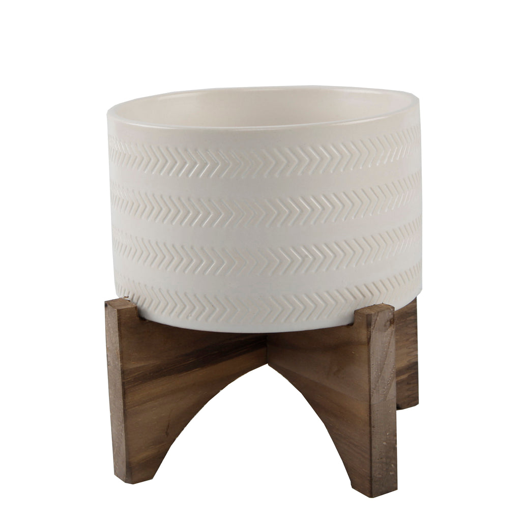 5" Arrow Ceramic Planter on Wood Stand,Matte White.