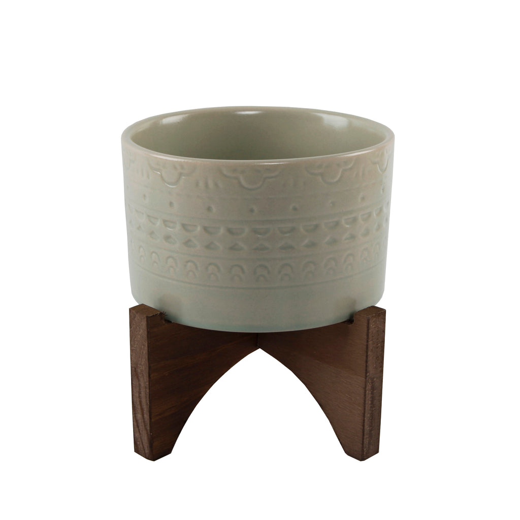 5" Mayan Ceramic Planter on Wood Stand,Matte Sage