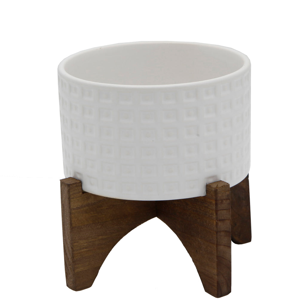 Stand by me! Place these Gladiator planters anywhere in your home to create a mid century modern style. Hand-crafted by Artisans, our ceramic planter on wood stand will help upgrade your plant game in style. Made of ceramic with a Gladiator pattern and a matte white finish, this tabletop planter will add a bit of chic nature to your living space. Buy a few at a time, so you can start your own little Garden indoors! (Hand-crafted by Artisans, Material: Ceramic, Wood. Size: 5.5"x5.5"x5.75", Inter: 4.25"x4.25"x2.5". Capacity: 17.64. Color: white, brown). ** No drainage hole.