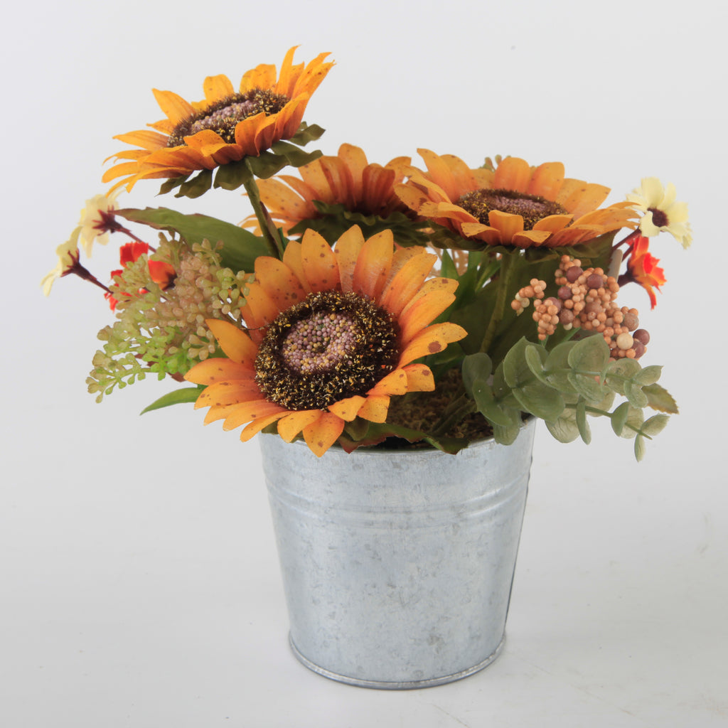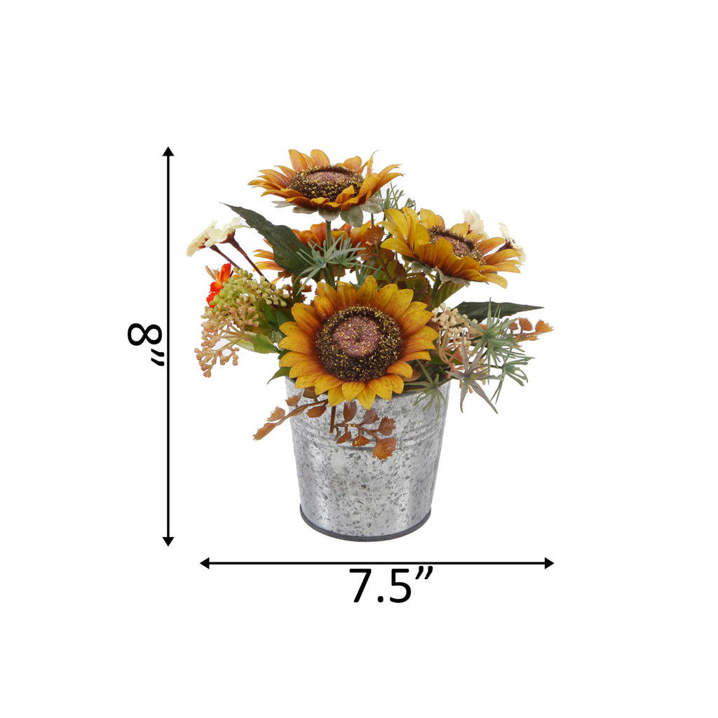 Farmhouse design for traditional Fall harvest décor. A festive mix of sunflowers in a farmhouse galvanized tin. This beautiful silk sunflower rrangement comes pre-fixed into a watering can. Arrange these flowers on a table in your entry way with other Fall items to welcome your guests. This arrangement will surely help complete your Autumn indoor decor. (Hand-crafted by Artisans, Material: Silk Flowers, tin, Size: 7.5” x 7.5” x 8”, Color: Yellow, Silver.)