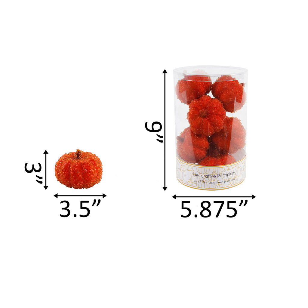 Contemporary design for traditional Fall harvest décor. This pack of 8 beaded mini heirloom pumpkins in Dark Orange will bring a chic and festive look to any tabletop and Autumn display. Arrange these pumpkins on a table in your entry way with other Fall items and baskets to welcome your guests. Painted a soft creamy whitewashed color, they will go with any décor from modern to rustic. Add these faux pumpkins to cornucopias, add in with other fruit and veggies in a bowl for centerpieces or even add to wreaths and garlands. Their dense foam construction make them lightweight and easy to display. Destined for vases, bowls, candlescapes, table scatters and floral arrangements, our beaded pumpkins will help complete your indoor decor. Sizes may vary slightly. **Recommended for indoor use. (Hand-crafted by Artisans, Material: Foam. Size: 5.875”x5.875”x9”, Set of 8 in Dark Orange, beaded accent, Due to handcrafting, slight variations may occur, Packaging: plastic cylinder.
