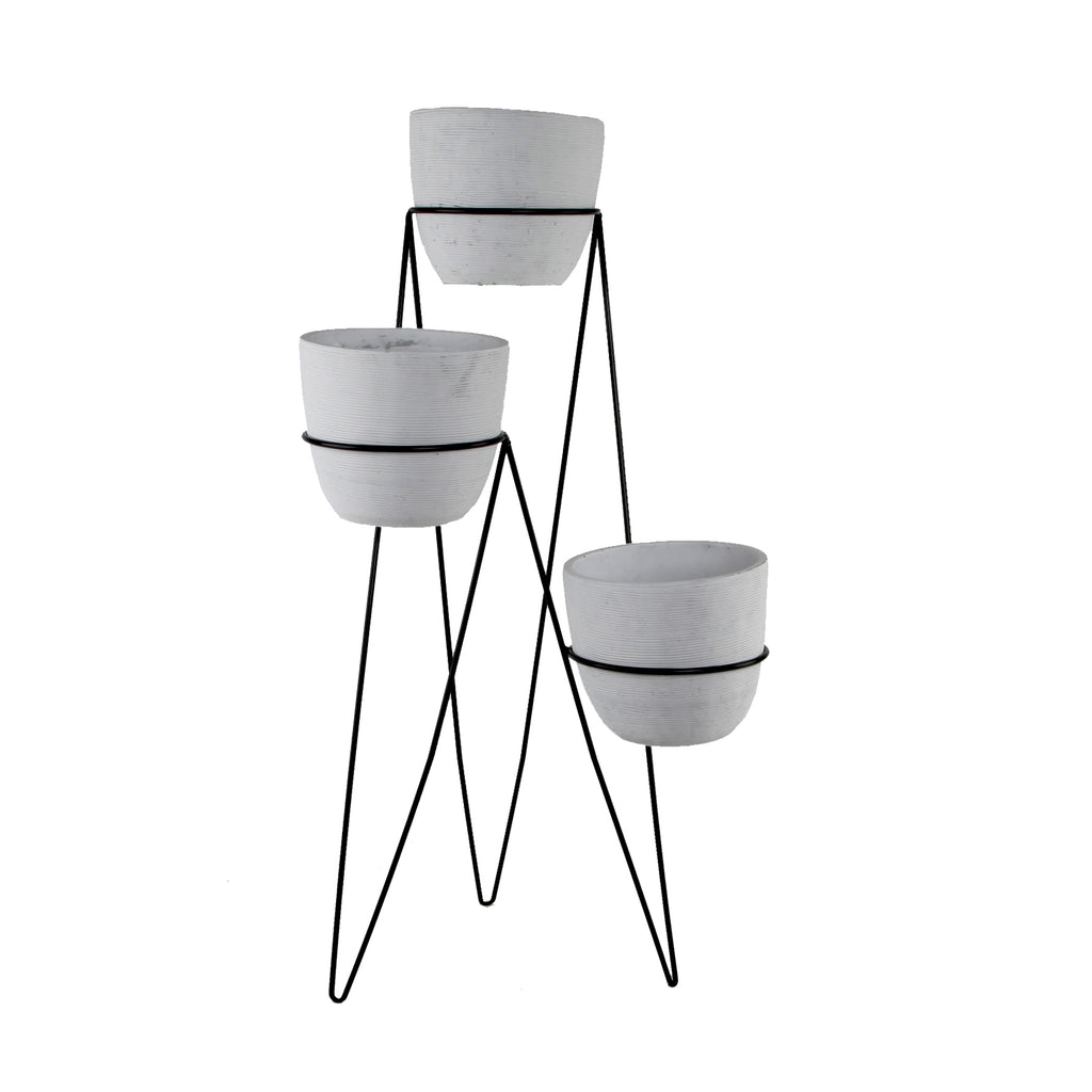 Stand by me! Place this 3-Tier Lava White Cement Pots on Hair Pin Leg Stand anywhere in your home to create an indoor Oasis. Hand-crafted by Artisans, our Cement planter on Hair Pin stand will help upgrade your plant game in style. Made of Cement and white paint, this 15" x 15" x 26" indoor planter will add a bit of chic nature to your living space. The perfect planter for planting succulents, terrariums, and indoor house plants. There is no drainage hole, so no spill and no mess! We always strive to make your life easier so you that you can have more time for the important things in life. Buy a few at a time, so you can start a little Indoor Garden! (Hand-crafted by Artisans; Material: Cement, Metal; Size: 15" x 15" x 26"; Color: White, Black-stand). ** No drainage hole, for Indoor use only.