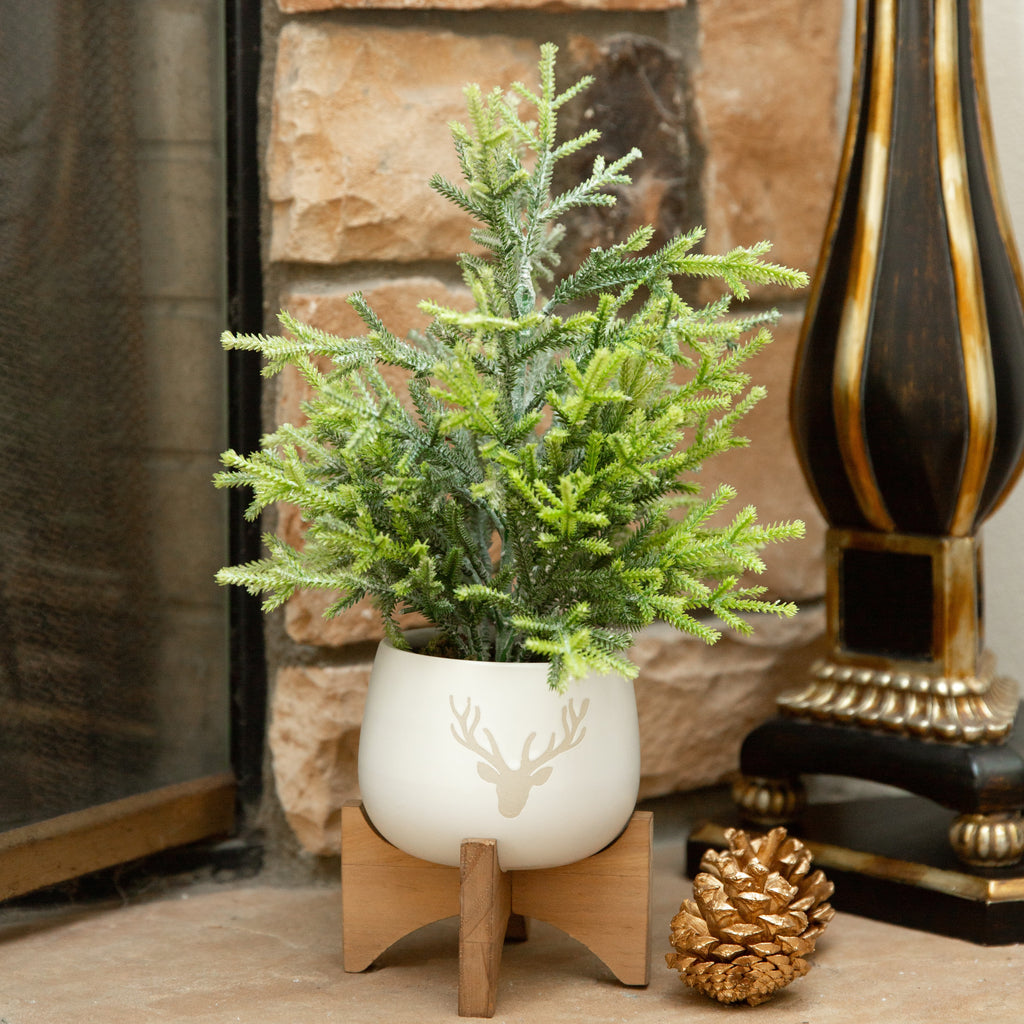 Christmas is here! Adorn your home or workspace with this adorable 15.75"H Frosted Xmas Tree in 5" Staghead Ceramic Pot on Wood Stand. Made of Ceramic and painted white with Staghead pattern, this 8" x 8 "x 15.75" Christmas Tree will add a bit of Holiday Cheer to your living space. Christmas arrangements are included, so you never have to worry about watering real plants again! Beauty without the pain of caring for real plants. We always strive to make your life easier so you that you can have more time for the important things in life. (Hand-crafted by Artisans; Material: Ceramic, Assorted Christmas arrangements, Plastic; Size: 8" x 8 "x 15.75"; Color: White,Brown, Black, Green, Gold). ** No drainage hole, for Indoor Use Only.