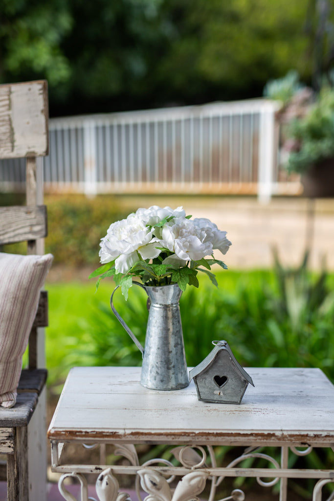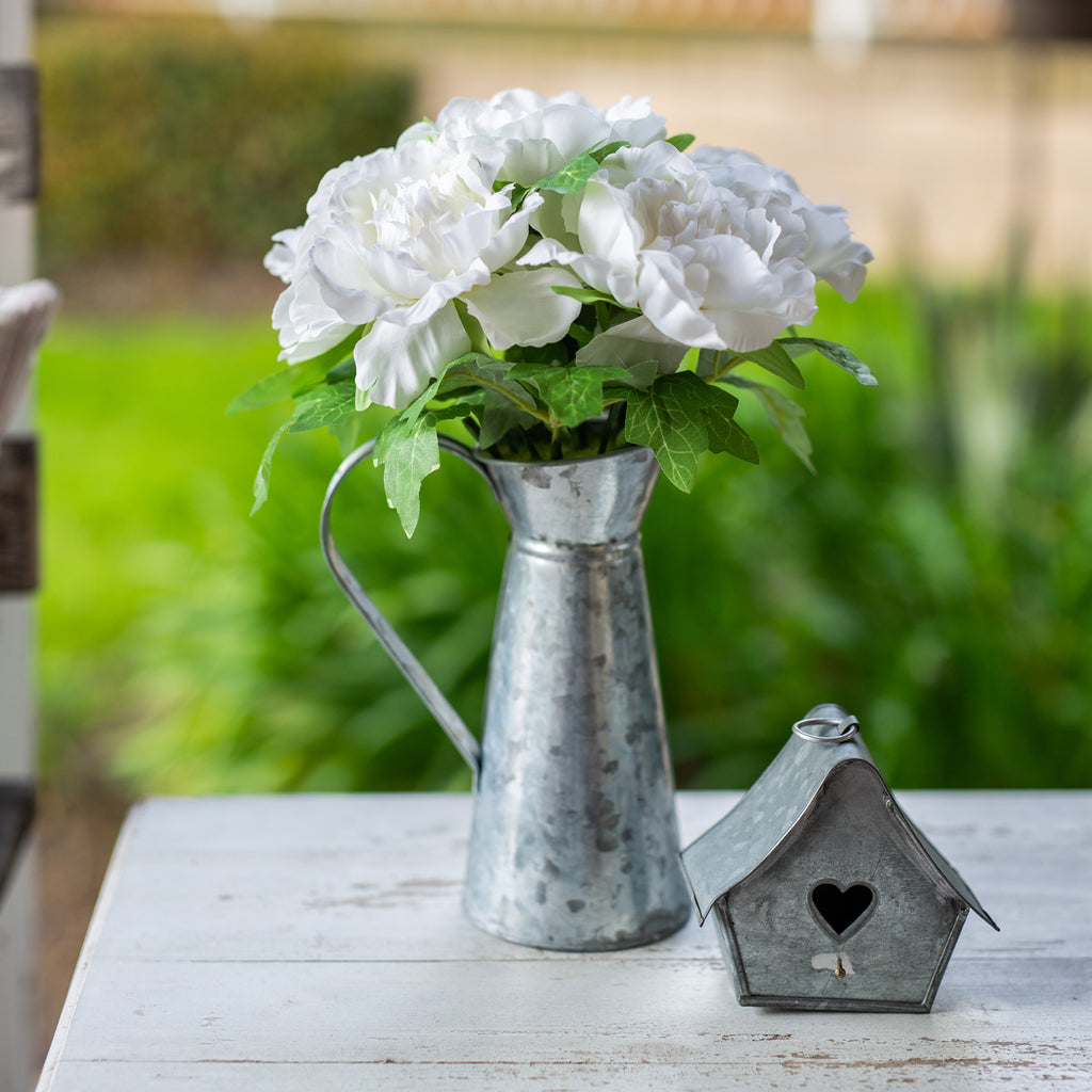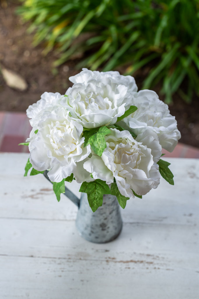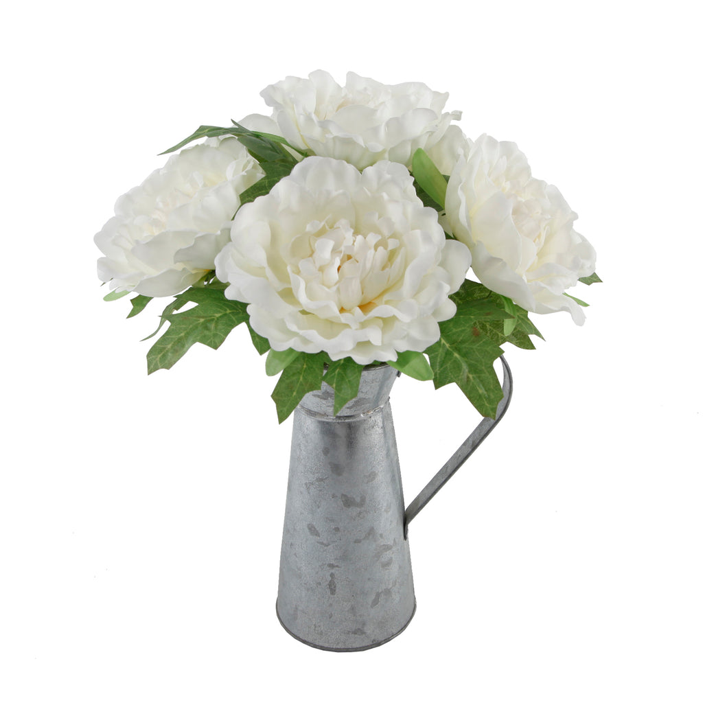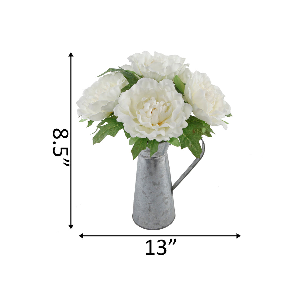 French Country style for Spring and Everyday décor. A fresh arrangement of White Peonies in a galvanized tin. This beautiful silk rose arrangement comes pre-fixed into a galvanized tin. Arrange these flowers on a tabletop or entryway with other Spring items to welcome your guests. This arrangement will surely help complete your Spring indoor decor! ( Material: Silk, plastic, metal. Size: 8.5" x 8.5" x 13". Color: White, green.)