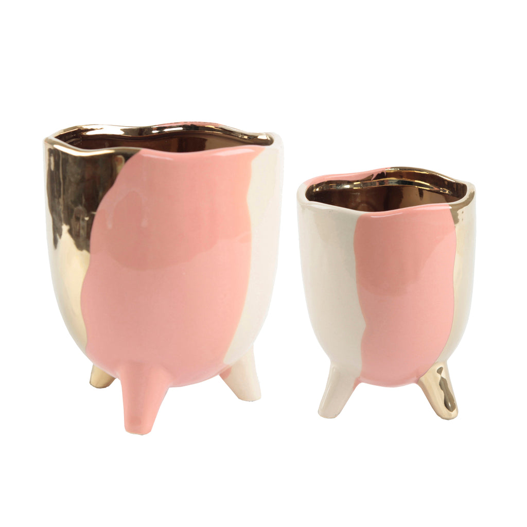 Decorate your home or office in Mid Century Modern style with our charming Set of Two 3-Tone Footed Ceramic planters. Hand-crafted by Artisans using superior ceramic material, these 3-tone planters give a clean and chic feel to any tabletop, entry way, or window sill. Made of Ceramic and painted Blush Pink, Gold, and Cream, this 4.5"x4.5"x5" indoor planter will add a bit of charm to your living space. Buy a few at a time, so you can start your own little Indoor Garden! Both Adults and Children go Wild for these adorable and fun 3-tone planters! (Hand-crafted by Artisans; Material: Ceramic. Size: 4.5"x4.5"x5"; Color: Blush, Gold, Cream.) ** No drainage hole, for Indoor use only.